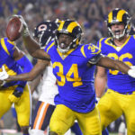 Gurley — who went over 5,000 yards of career rushing — came in averaging 53.5 rushing yards per game, but had 63 in the first half, including three carries of 10 yards or more. His TD was set up when Goff connected with Kupp for a 50-yard gain. Kupp beat Buster Skrine up the left sideline and hauled in the pass at the 15 before he fumbled going out of bounds at the 1. It appeared as if Kupp might have fumbled it at the pylon, which would have been a Chicago touchback.
