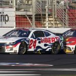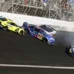 Chastain made quite a comeback after blowing a tire early in the race while leading. Ricky Stenhouse Jr. also blew a tire while running up front. Reigning series champion Kyle Larson, the front of his No. 5 Chevrolet patched with tape, had just surrendered the top spot when Denny Hamlin bumped him from behind, looking to give him a helpful push — only to send him into a spin that knocked them both out of the race.